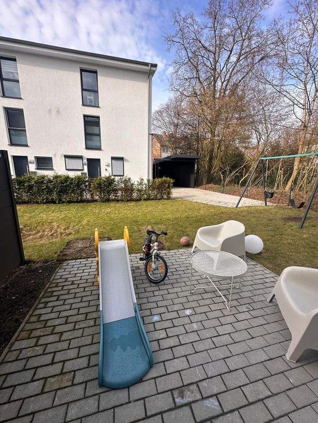 Neubau mit Wärmepumpe, Fußbodenheizung, kontrolierte Belüftungsanlage, dreifach Verglasung, Terrasse mit Gartenanteil, weiße Einbauküche, Gäste-WC, Vollbad mit Wanne und Dusche und Fenster im 1. OG, Wirtschaftsraum mit Waschmaschinenanschluss im 1. OG, Schlafzimmer mit begehbaren Ankleideschrank, 2 Kinder oder Arbeitszimmer im Staffelgeschoss mit zusätzlichen Duschbad mit Fenster große sonnige Dachterrasse, weiß gestrichen, Vinyldesign Bodenbeläge