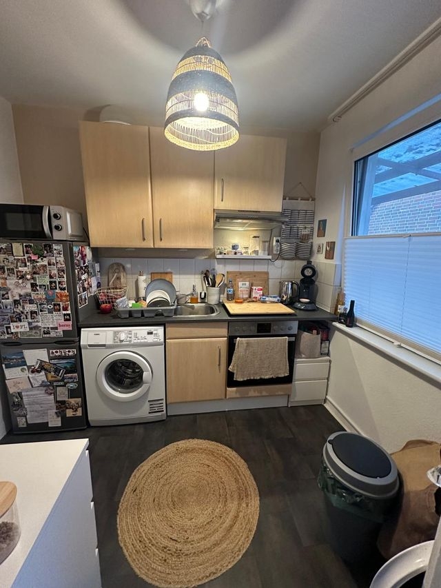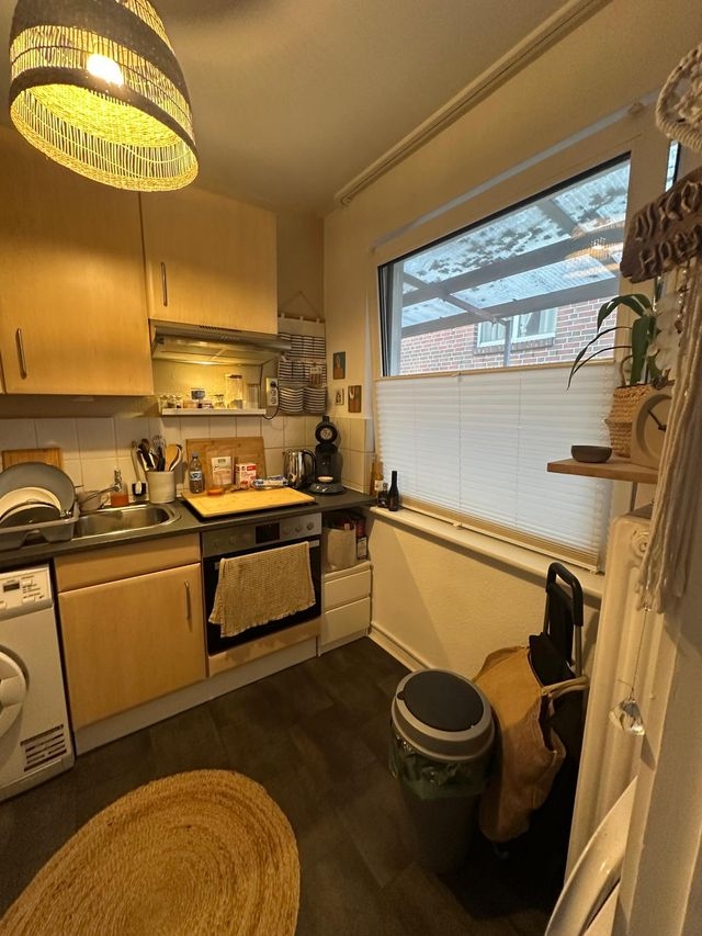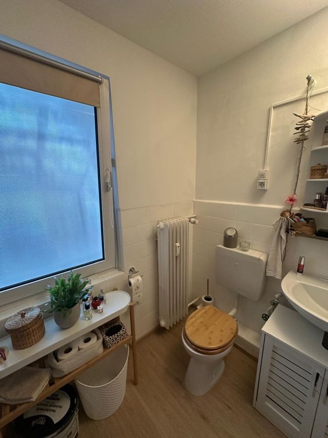 heller Klinker, massivbauweise, weiße Kunststoff-Fenster mit Isolierverglasung, sonniger Süd-Balkon, Wohnzimmer und Schlafzimmer sowie Flur ist mit Laminat versehen, helle Einbauküche mit Anschluss für eine Waschmaschine, helles Vollbad mit Fenster, Kellerraum, Glasfaser Anschluss über Wilhelm Tel.
